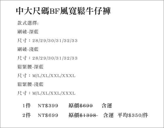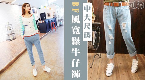 商品訊息簡述: 平均每件最低只要350元起(含運)即可購得中大尺碼BF風寬鬆牛仔褲1件/2件,款式:刷破/鬆緊腰,顏色:淺藍/深藍,皆有多尺寸任選。